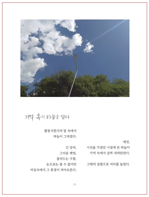 우리는 각자의 방식으로 삶을 기억합니다. 누군가는 눈으로, 또 누군가는 소 리와 촉감, 그리고 마음에 떠 오르는 느낌으로 『책+사진, 일상을 담다』는 그 런 서로 다른 느낌들이 만나 한 권의 기억이 되었습니다. 이 책은 ‘보지 못함’ 의 이야기가 아니라, ‘다르게 보고 느낀’ 삶을 함께 담아낸 기록입니다.
